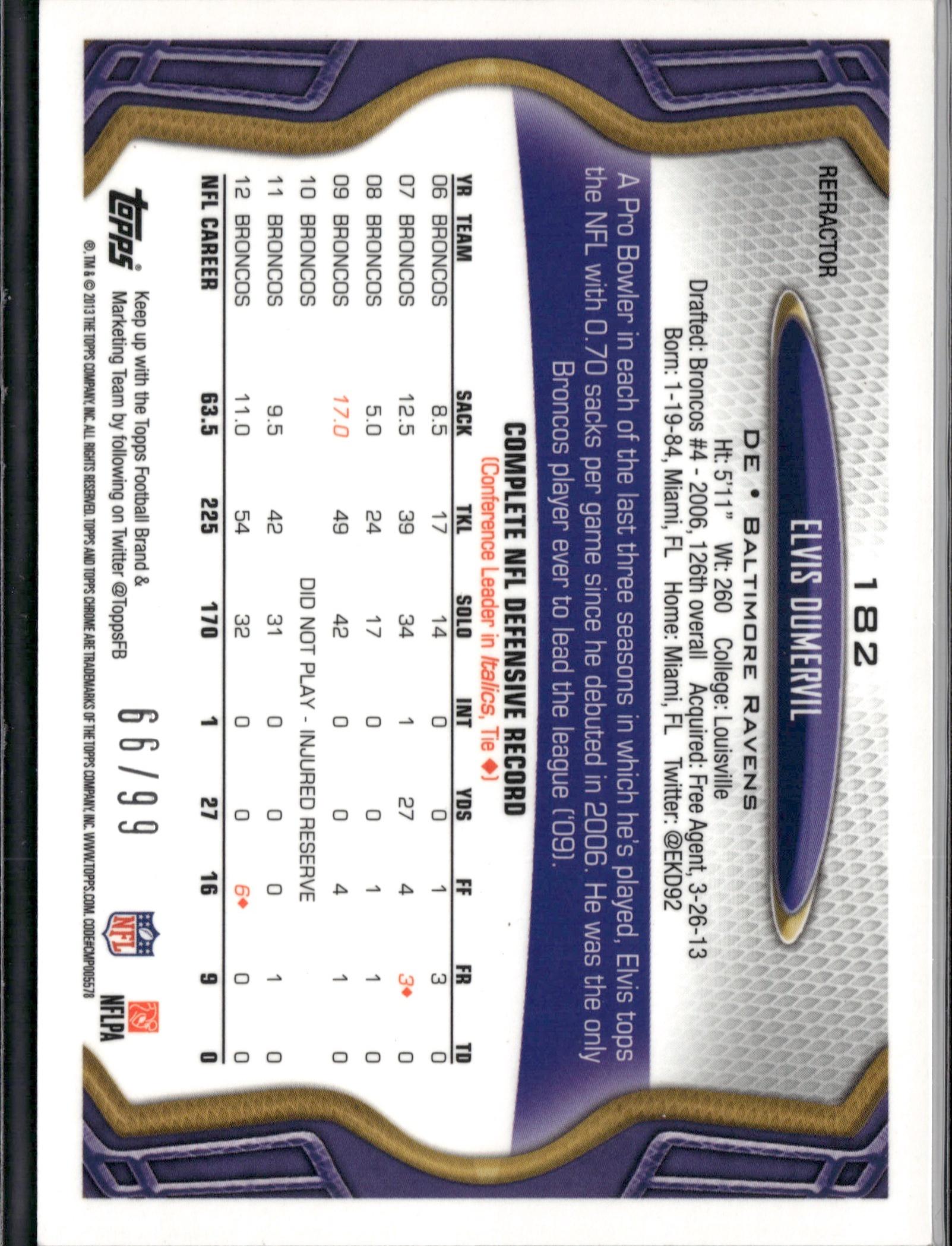 This listing features a 2013 Topps Chrome Sepia Refractors #/99 card of Elvis Dumervil, who played for the Baltimore Ravens during the 2013 season. Please review all images carefully, as they are part of the description and show the card’s condition and centering. All our sports cards are in Near Mint or better condition unless otherwise stated. We take pride in offering high-quality collectibles to enthusiasts and collectors alike. Please note that while we provide our best assessment of the card's condition, we cannot be held liable for any grading outcomes should you choose to have the card professionally graded.